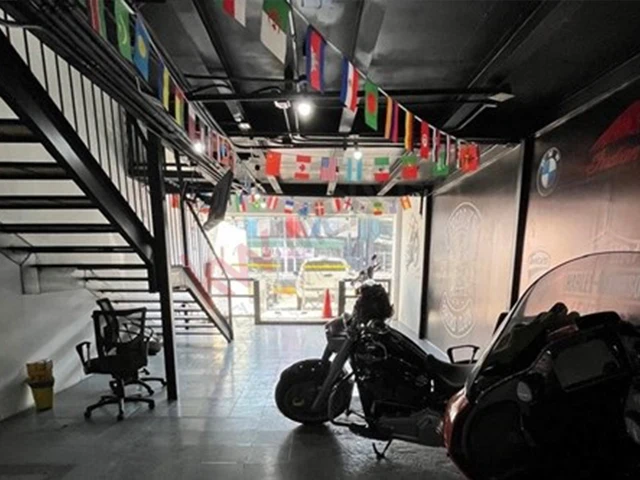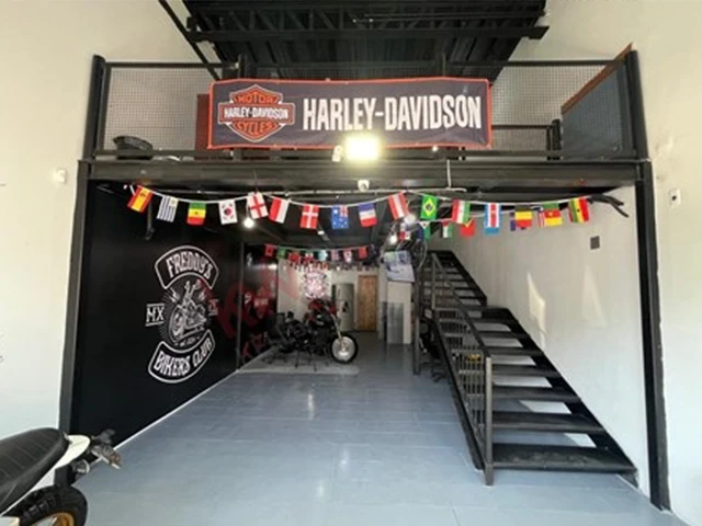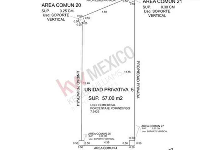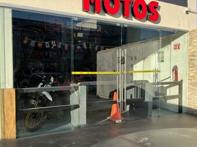 Area de estacionamiento común, puertas dobles de cristal y gran ventanal en la parte superior, cuenta con area de 57 m2 en planta baja y un mezanine de 47.5 m2 el local es de doble altura.
